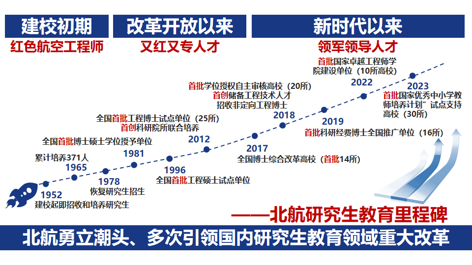 研究生培养成效日益凸显,近两年,以北航为第一署名单位,研究生为第一作者发表Nature/Science正刊3篇,获评北京市优秀博士学位论文(含提名)17篇、北京市优秀研究生指导教师11位、北京市优秀研究生指导教师团队5个。先后有近200名研究生成为国家级科技奖励署名获奖人。学校在中国国际“互联网+”大赛中,学校八年四进总决赛,获得冠军1次、亚军3次,被授予“中国研究生创新实践系列大赛十年发展重要贡献单位”。研究生毕业生就业水平保持高位稳定,“长征”系列运载火箭、航空发动机的大部分总师、载人航天工程超过1/3的高级技术和管理人员均为北航校友,超过3/4在航空航天和国民经济主流行业就业。
