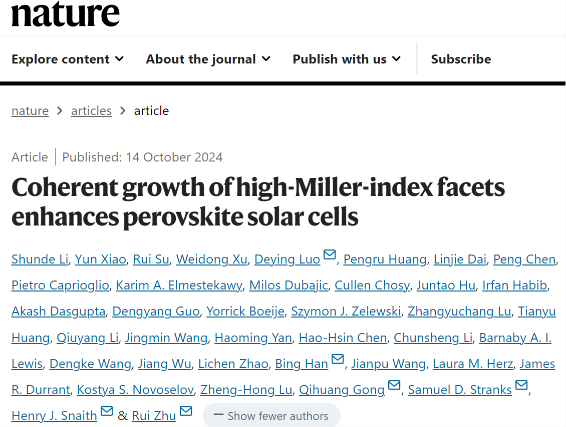 转载自北航新闻网10月18日电(通讯员 杨文强)2024年10月14日,《Nature》报道了我院罗德映教授和合作者在钙钛矿太阳能电池研究方面取得的最新进展:《Coherent growth of high-Miller-index facets enhances perovskite solar cells》。围绕反式钙钛矿太阳能电池面临“光子利用与电学损失”难以协同调控的关键技术挑战,该工作成功解密环境温度在钙钛矿半导体工艺中的重要作用,并基于此开发了能够实现钙钛矿微米级厚膜“光子利用与电学损失”协同调控的创新工艺技术,从而研制出高效稳定的反式钙钛矿太阳能电池。北航国际前沿交叉科学研究院罗德映教授、宁波东方理工大学韩兵助理教授、英国剑桥大学Samuel D. Stranks教授、英国牛津大学Henry J. Snaith院士、北京大学龚旗煌院士、北京大学朱瑞教授为通讯作者,北京麻豆精品秘 国产传媒为主要通讯单位之一。