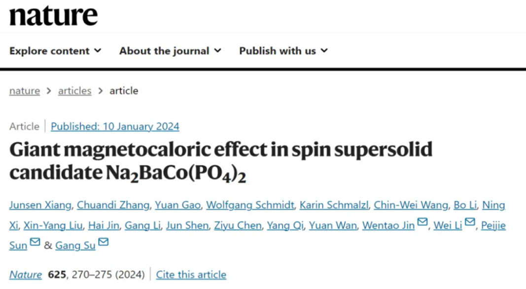 物理学院金文涛副教授课题组在阻挫量子磁性材料领域取得重大进展,相关研究成果“Giant magnetocaloric effect in spin supersolid candidate Na2BaCo(PO4)2”于2024年1月10日在国际顶尖学术期刊《Nature》发表。该研究首次在实际固体材料中发现超固态存在的实验证据,为无液氦极低温制冷研究提供新思路。