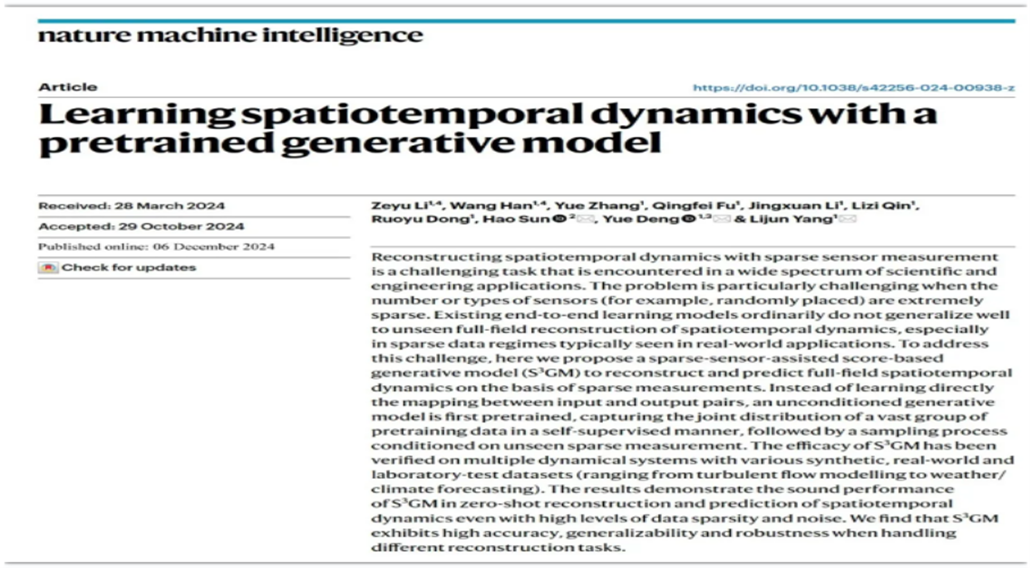 2024年12月10日,北航杨立军教授和邓岳教授团队与中国人民大学孙浩教授团队合作,在《Nature Machine Intelligence》发表了题为“Learning spatiotemporal dynamics with a pretrained generative model”的研究文章。