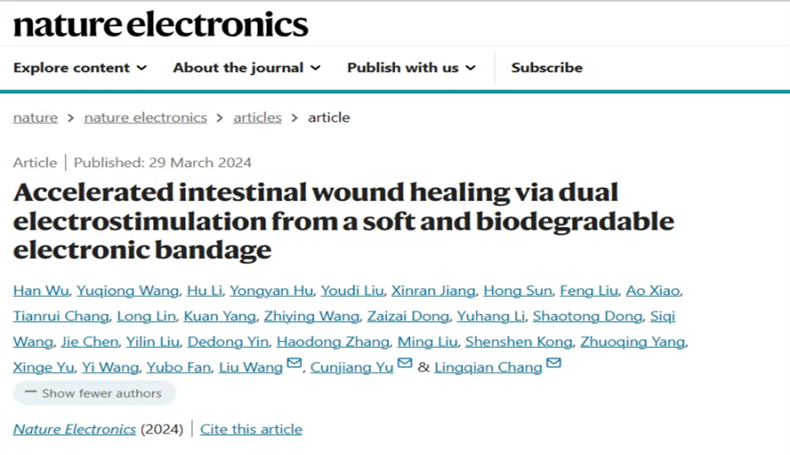 在肠道伤口愈合领域,生物与医学工程学院也取得了创新性成果,常凌乾教授团队成功研发出一种柔性、可生物降解、自供电的“电子绷带”。研究成果已于2024年3月29日在国际顶级期刊《Nature Electronics》发表。