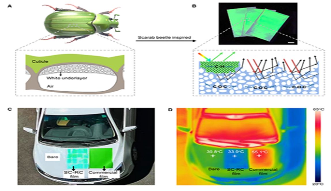 2024年11月,受自然界金龟子鞘翅结构中分级结构的启发,江雷院士团队和中国科学院化学研究所宋延林团队在彩色辐射制冷材料的研究中取得重要进展,该研究成果以“Brilliant Colorful Daytime Radiative Cooling Coating Mimicking Scarab Beetle”为题发表在《Matter》期刊。