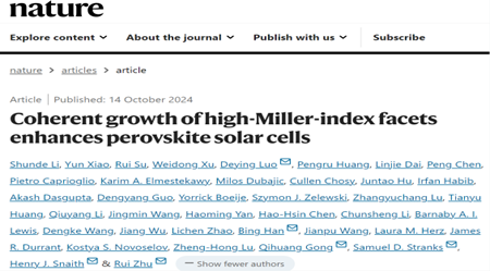 国交院罗德映教授及其合作者在钙钛矿太阳能电池领域取得了突破性进展,并于《Nature》成功发表相关研究成果,题为“Coherent growth of high-Miller-index facets enhances perovskite solar cells”。