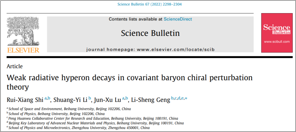 近日,彭桓武科教合作中心耿立升教授团队在超子弱辐射衰变研究中取得重要进展,相关成果以“Weak radiative hyperon decays in covariant baryon chiral perturbation theory”为题,于2022年12月2日发表在中国卓越计划领军期刊《Science Bulletin》上。